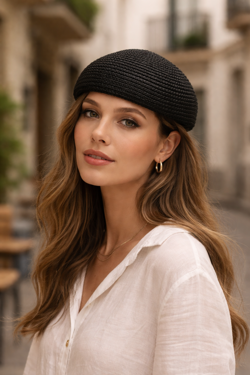 This is our beret, handcrafted from natural straw. It is lightweight and breathable, making it perfect for everyday wear and also ideal for special occasions.
